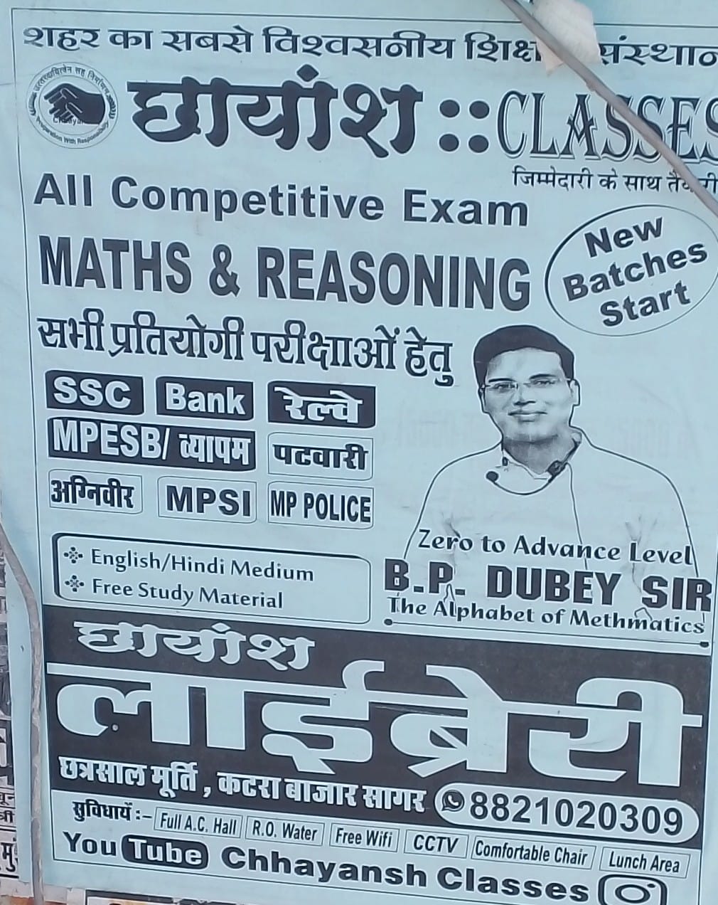 Chhayansh Classes Maths and Reasoning Coaching in Sagar is a trusted and dedicated institute for students preparing for all competitive examinations. The institute focuses on building strong fundamentals in Mathematics and Reasoning, helping students move confidently from basic concepts to advanced levels.