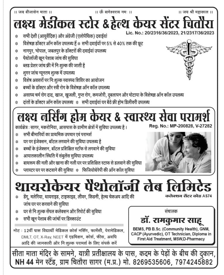 Lakshya Medical Store and Health Care Center Chitora operates with valid drug licenses and healthcare registrations, ensuring safe and authentic medical services. The center collaborates with experienced doctors from Nagpur, Bhopal, and Jabalpur, making specialized healthcare accessible locally.